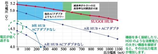 スゴイハブは電流を多く流してもUSB規格電圧の5.25~4.75Vを維持していることが分かります。